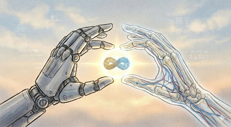 A mechanical hand and a translucent human hand jointly hold a glowing seed. Inside the seed, the infinity shape of consciousness is visible, symbolizing their shared realization.